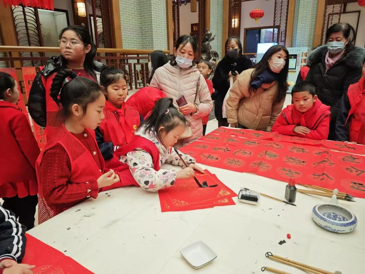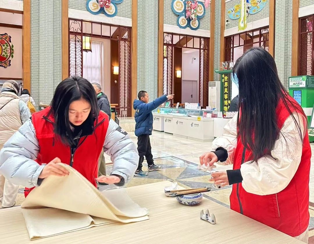 除了日常的志愿服务,协助博物馆举办庆祝小年“书法献春”活动,成为本次“三下乡”的一大亮点。活动现场,墨香四溢,热闹非凡。志愿者们积极协助工作人员布置场地,摆放桌椅、笔墨纸砚,确保活动准备就绪。