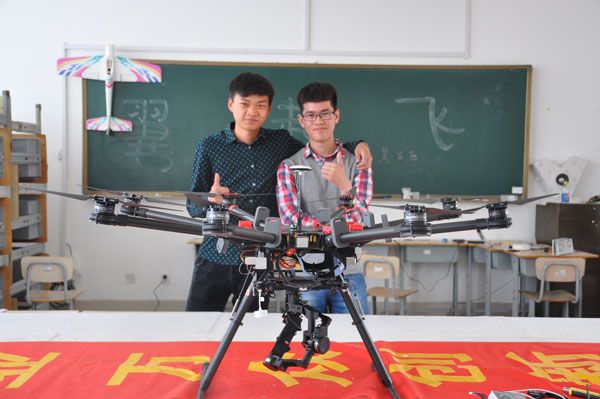 “从四旋翼进化到技术比较先进的八旋翼,我原先的计划是到2016年的5月,但是没想到现在就实现了,比我的计划提前了好多。”半年多的时间接二连三的加速,让低调的程文明觉得有些始料未及。“我们在操场上试飞的时候,遇到了学校分管学生工作的领导,他很感兴趣,和我们聊了很长时间。过了几天,竟然为我们申请下来一间闲置的教室作为工作室。”创业计划的第一次提速,程文明和小伙伴们顺势成立了自己的大视界航模工作室,还在淘宝上开起了网店。程文明是“飞手”,主攻操控,同校的范俊阳是“云台手”,控制相机拍摄,远在新疆的龙孔强则负责后期剪辑,这期间四旋翼进化为六旋翼。