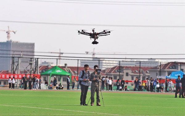 程文明与范俊阳操控八旋翼无人机航拍校运会
