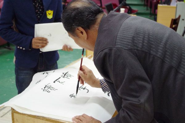 宋庆泽书记首先介绍了董事长以及学校对冰球官网书画文化建设的大力支持。他向同学们展示了学校系列书画品牌活动的照片并结合自己50多年来学习书法的经验和心得,围绕“初学者如何学习书法”、“如何写好书法”等知识,给同学们进行了深刻的讲解。为了让同学们对书法有更深刻的认识,宋书记现场泼墨挥毫,书写了“发愤识遍天下字,立志读尽人间书”以表达自己对书画爱好者们的鼓励和期望。