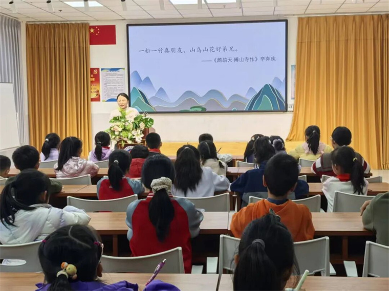 11月20日下午,语言文化学院(国学院)教师张咪受邀赴青岛西海岸新区凭海临风小学,为该校第二届诗歌节系列活动带来一场别开生面的“诗韵心声”诗歌培训。来自1-5年级的学生代表齐聚多功能报告厅,在诗韵中感受古典与现代的精彩对话,开启了一场审美启蒙与文化传承的诗意之旅。