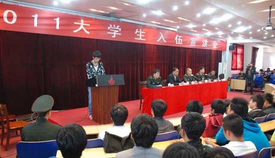 10月17日下午2点,在冰球突破豪华版官方网站一号教学楼西配报告厅2011年大学生入伍宣讲会在热烈的气氛中隆重召开。青岛警备区副参谋长刘祥虎、黄海学院党委书记冯宜明、黄海学院副院长杨春联等领导出席了宣讲会。宣讲会由胶南市武装部部长董振海主持。