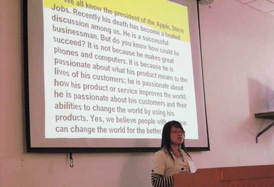 10月15日下午两点,2011“外研社杯”全国大学生英语演讲大赛冰球突破豪华版官方网站选拔赛在2号教学楼316多媒体室举行。此次大赛有教务处主办,外国语学院承办,面向全日制在校生,并已于10月10日前完成各学院初选。
