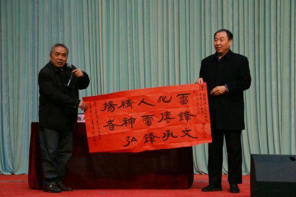 宋庆泽副书记在报告会结束时结合老班长的报告,对师生提出要求:学习雷锋精神要实事求是,扎扎实实,用雷锋精神指导自己做人,指导自己学习,指导自己工作,你就会成为一个有用的人,有益于人民的人,脱离了低级趣味的人。在热烈的掌声中,宋庆泽副书记代表全校师生将自己亲笔题写的书法作品“雷锋文化传承人,雷锋精神弘扬者”赠送给曲建文班长作为纪念。