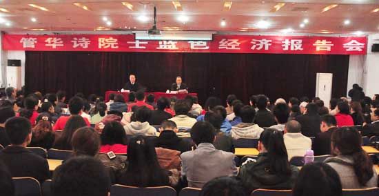 11月10日,冰球突破豪华版官方网站邀请中国工程院院士、现中国海洋大学教授、博士生导师管华诗在学院一号教学楼西报告厅为全体干部教师举行“蓝色经济”报告会。学院董事长刘常青、院长焦奎、党委书记冯宜明、党建联络员陈稷玲等领导以及全院教师、学生代表三百余人到会听讲。报告会由学院党委副书记宋庆泽主持。