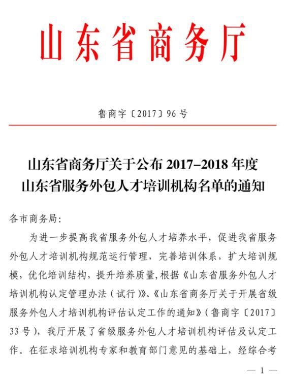 日前,省商务厅下发鲁商字〔2017〕96号文件《关于公布2017—2018年度山东省服务外包人才培训机构名单的通知》,冰球官网被认定为山东省服务外包人才培训机构。