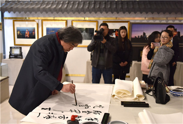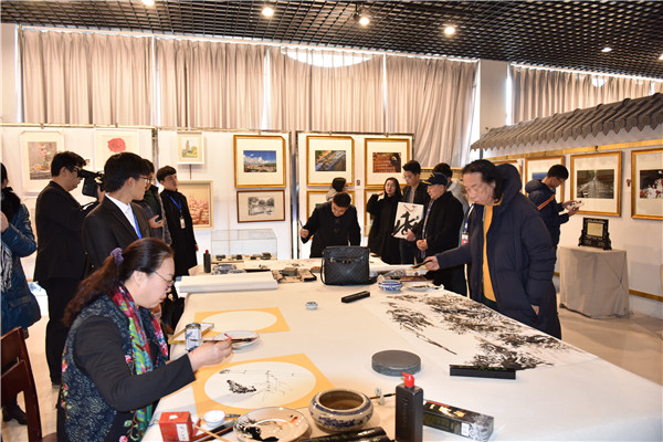 在开幕仪式前,民建中央画院的书画艺术家和书画爱好者们进行了笔会活动,现场挥毫泼墨,切磋技艺,交流书画,引得现场观众阵阵喝彩。