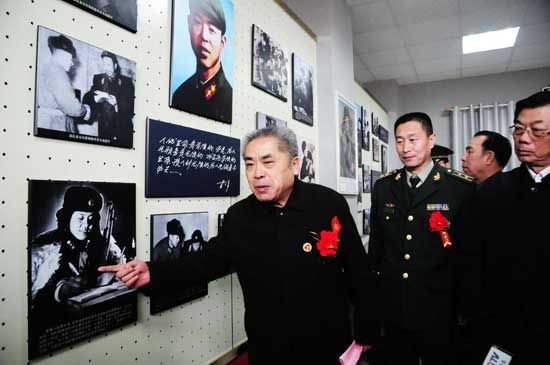 雷锋班第四任班长曲建文(左一)在冰球突破豪华版官方网站向与会领导嘉宾讲解雷锋事迹
