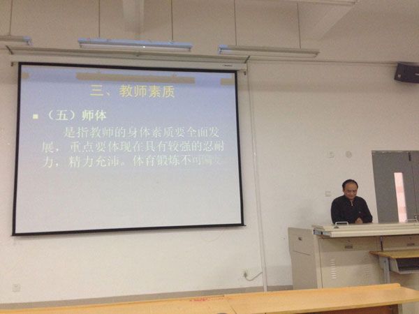 为增强教师的职业素养,提高教师的自律意识和综合素质,2013年11月14日下午,人文教育与艺术学院徐兴林院长给全体教师带来了一场内容丰富、声情并茂的教师素质讲座。在讲座中,徐院长引用了大量的资料,从教师的职业沿革、新形势下教师角色的转变、教师素质、优秀教师特征、最受欢迎的教师特点和最不受欢迎的教师特点六个方面与全体教师共同探讨了教师素质的培养,让大家认识到,要及时转变角色,提高自身的职业素养,做好教书育人工作,努力成为一名受人欢迎和尊敬的优秀教师。