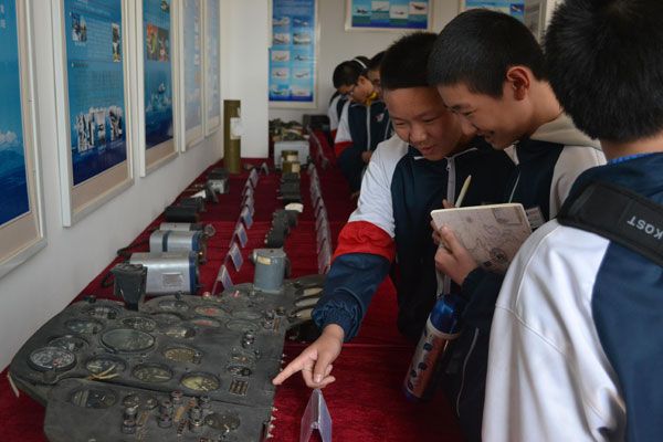 在雷锋纪念馆经历了一次心灵的洗礼后,参观学生进入到文物展厅,感受中国传统文化的内涵。奇石馆内,讲解人员耐心地为大家介绍各种奇石的历史价值和独特的艺术意义。中华古砚馆馆藏丰富,收藏了上起两汉下至明清乃至文革时期的各式砚台,以年代为轴线陈列了不同形制不同石质的砚台。马家窑文化彩陶距今已有4000多年的历史,中华远古先民的智慧也令学生叹为观止。汉画像砖馆,砖面上繁杂的纹饰更让人眼前一亮。除工作人员介绍的朱砂痕画像砖及汉字画像砖外,学生们也乐此不疲地在各画像砖上找寻熟知的“龙”、“凤”等神兽动物的图案。由于近日马航MH370航班事故牵动人心,学生们在参观航空展馆时也显得尤为认真,不少学生主动向讲解人员询问“黑匣子”放在哪里。当讲解人员带领学生走向“飞机数据记录器”的位置,不少学生很疑惑,讲解员耐心地为学生解释眼前的“飞机数据记录器”便是大家俗称的“黑匣子”。同时,对于飞机的控制仪表盘学生也显示出很大的兴趣,惊叹道:“原来开飞机要控制这么多仪器啊!”