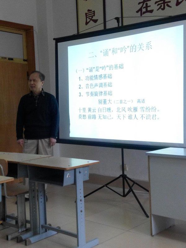 3月10日下午,国学院举办“诗词吟诵专题讲座”,聘请语言学专家周继圣教授,系统讲解了吟诵基本常识,进行了数十首诗词的专题研究和精彩的吟诵展示。