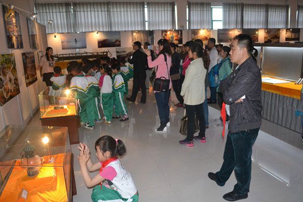 刚来时还听说,古砚是这个博物馆的特色,心想啊,不就是块能磨墨的石头吗?看完后发现自己其实不是没有多大文化,纯粹就是没文化!这年头没文化最可怕!尤其面对文化时还不知道是文化!扯远了,还是说说砚台吧!那方唐代的龟砚扭头微仰的样子着实好可爱,真想象不出古人有如此的创造力,在它上面磨墨应是何等的感受,难怪要吸引我们赶来围观了,快来人把它带走吧,不然真的想要绑架它了!还有专门适合北方寒冷季节加注热水就可使用的瓷暖砚,加碳火就可使用铁暖砚等等,都有不少的粉丝,又拍照又记录的。我对那方高高的腰鼓式砚台超级感兴趣,砚台怎么就这高呢?想了半天真是不得其解啊,干脆问了老师,原来古人是席地而作,为了书写方便,啊,竟如此简单!砚台里面学问多啊,不细细说了,改天还是你自己直扑到这儿吧!在一个听雨舫牌匾的房间里,全是木器,大器小器,宫廷民俗,紫檀楠木等应有尽有,这个展厅看的人、问的人都很多,尤其那些雕木印刷板子,告诉我们古人的书原来是这么印出来的,不简单不简单,长知识了。还有满是坛坛罐罐的一个房间里, 每个上面都有怪异图纹,问了老师说是仰韶文化彩陶,“仰韶”两字不会写,什么意思也不知道,别急别急,下次咱再来!不要忘记在一个不算起眼的角落里,有一件约近4000年前的人头形彩陶,表情怪怪的,尤其形似骷髅,又有些恐怖,看他惊异神秘神情的样子,活脱脱像极了西方一位大师的作品《呐喊》中的陌生男!还有一件彩陶上描绘了一个舞者,他们到底想要诉说什么,我也不知道!有兴趣的话还是先找到它们,再问问博物馆老师们吧!记得不要错过哟!还有新近才办的海洋文化展,有两件水浮司南,听名字就好笑又好玩,还有水下钧瓷,不是说过吗,“家存百贯,不如钧瓷一片儿”,我的妈啊,打劫了!还是在心里喊吧,保安大叔在呢!博物馆里面想说的东西太多,比如在航空展馆里你可以感受一下战斗机防弹玻璃的厚度,揭开“黑匣子”的神秘面纱等等。至于还有那么多就不细细说了,你最好还是自己来探究一番吧!还有可爱的家长们,也加赞一个,刚才我忍不住偷瞄了眼家长们在干啥?莫不是老样子专注于手机了?哇…人家紧跟着队伍走呢,听的还好认真,错怪了!错怪了!要是哪天咱自己一家三口再去一次,就让老爸当正讲解,老妈当副讲解,那才美呢!是不是想的又太美了?最后再赞一下黄海学院博物馆。博物馆的价值就在于文化传承,把公益做的那么纯粹,你们就是活雷锋呀!终于想通了,也难怪值得我们黄岛区实验三小几番踏足,尤其在我们这么重要的节日,加油吧!
