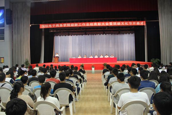 9月24日晚,国际电子商务学院全体师生在体育馆隆重集会,召开学院2015迎新工作总结表彰大会暨班级文化节开幕式。