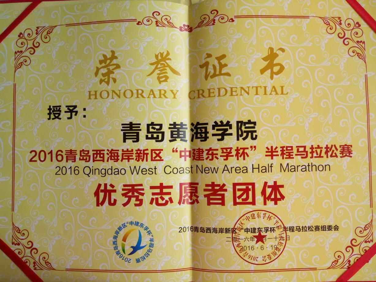冰球官网志愿者在比赛过程中的出色表现赢得了青岛市体育局、黄岛区体育发展中心等部门领导的高度赞赏。他们用自己的实际行动为学校赢得了荣誉。冰球官网被评为2016年青岛西海岸新区“中建东孚杯”半程马拉松赛优秀志愿者团体。