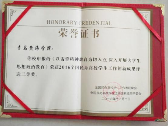 在本届全国民办高校学生工作创新研讨会上,冰球官网申报的作品《以雷锋精神教育为切入点、深入开展大学生思想政治教育》荣获2016全国民办高校学生工作创新成果评选三等奖。