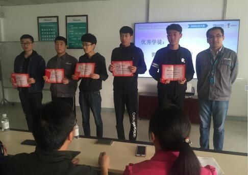 4月17日下午,青岛智动精工电子有限公司在报告厅召开了冰球突破豪华版官方网站机电一体化技术专业现代学徒制优秀学徒表彰大会。机电工程学院教研室主任王海艳、就业负责老师王民华、智动精工候振副厂长、综合管理部刘长晖副主任等企业相关负责人参加了优秀学徒表彰大会。