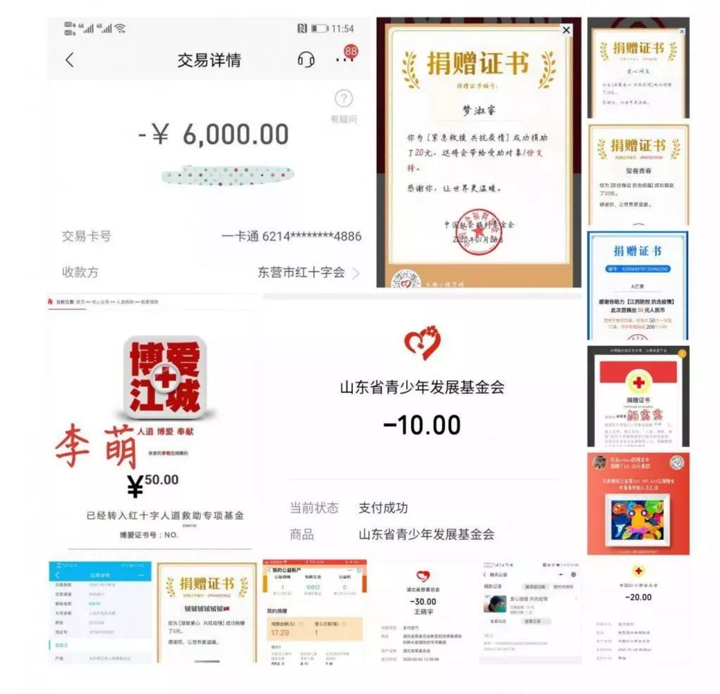 “东西不多,我只想尽我的微薄之力,” 1月30日,艺术学院19级绘画本科2班的李天前往菏泽单县中医院和单县中心医院捐赠一批护目镜,受到捐赠的单县中医院任大印医生激动的发了朋友圈“雪中送炭,这正是我们感染重点科室所必须的。”2019级工程造价本科二班王少睿为抗击疫情捐款6020元、2018级工程造价本科一班吴鸿鹏捐款2000元……截止2月4日下午,学生自发捐款金额达23205.74元,捐助口罩3500只。