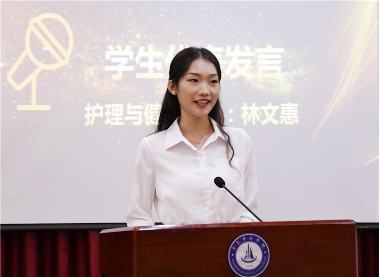 学生代表2019级护理学本科1班林文惠同学发言,她代表全体黄海学子向老师们致以崇高的敬意和节日的祝福。