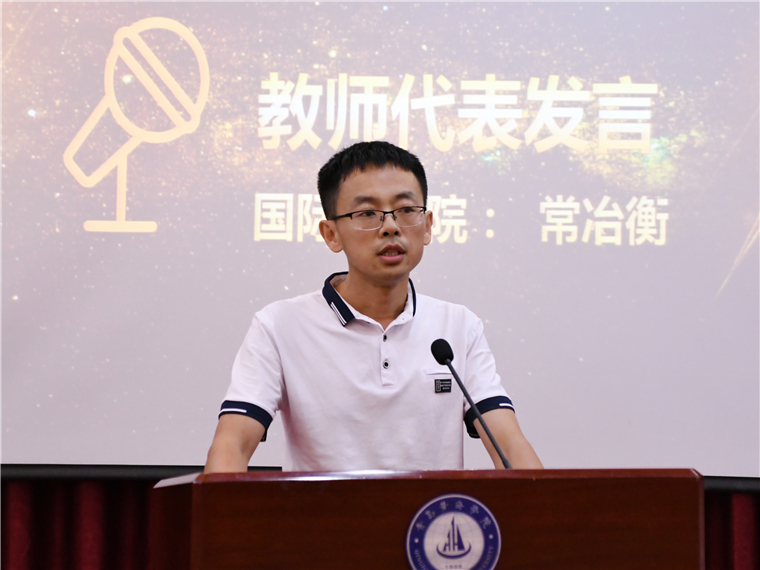 获奖教师代表国际商学院常冶衡老师发言,他表示将更加严格要求自己,发挥先锋表率作用,立足岗位刻苦钻研,不断提升业务能力,再创工作新佳绩。