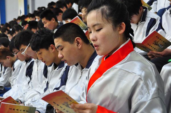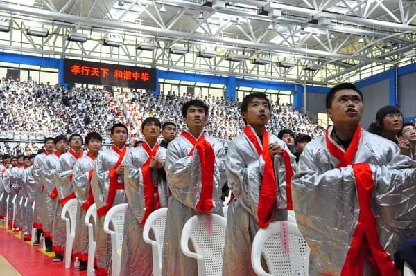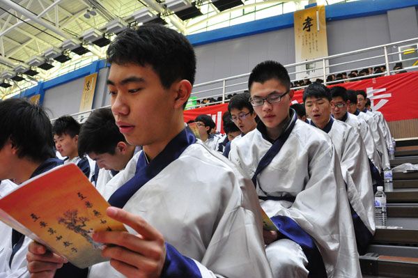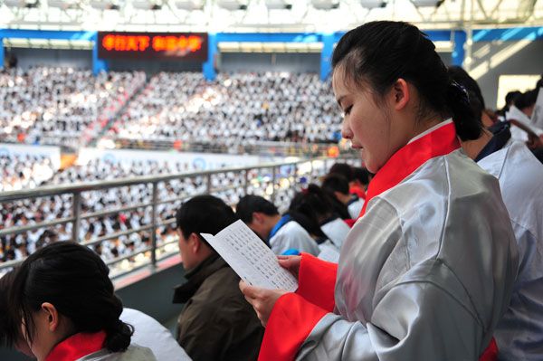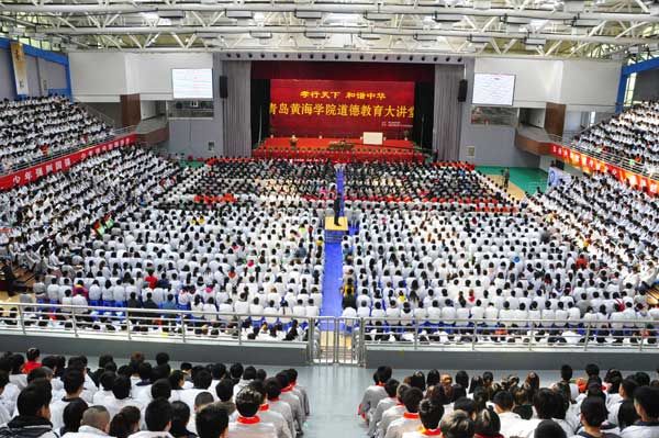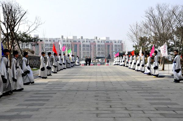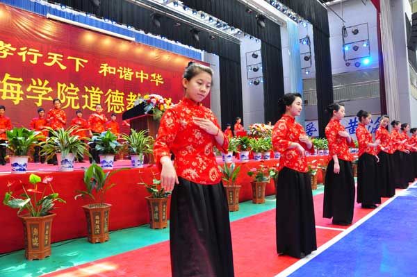 此次黄海学院举办的道德教育大讲堂为期三天,开讲当天,400名身着“汉服”和“唐装”的大学生在人群中备受瞩目,他们通过引领诵读儒学经典、汉服展示、汉家礼仪演示、手语节目等活动,为弘扬中华传统文化,为道德教育讲堂活动增添了浓厚的文化氛围。