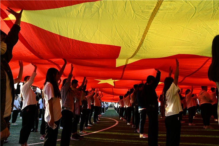 伴随着爱国歌曲《红旗飘飘》深情而激昂的旋律,巨幅国旗在同学们手中传递,爱国激情在每个黄海学子心中激荡。五星红旗,你是我的骄傲,五星红旗,我为你自豪!