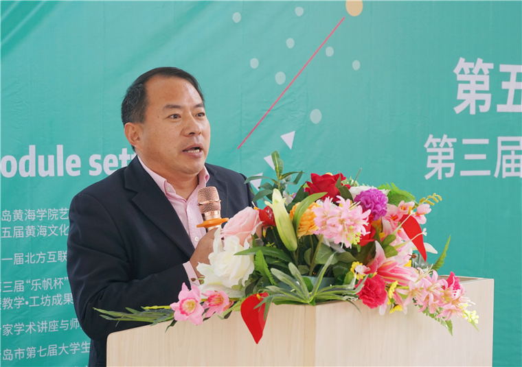 艺术学院院长马延岳致开幕词,合作企业代表青岛城心引力科技有限公司总经理 蒋礼、教师代表环境设计系主任杨元帅、优秀学生代表2018级绘画本科2班刘雅慧同学分别发言。