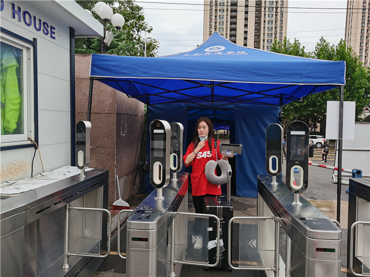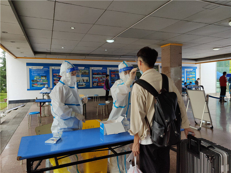 学校在南区南大门设置返校(报到)专用通道;学生入校时,保持1米间隔距离,自觉排队,按照流程进入校园;工作人员在入口处识别学生“健康码”(绿码放行)、对行李等物品进行消毒、测量体温、通过“人脸识别”门禁系统,审核符合返校(报到)学生身份,成功识别的学生,到达各学院报到点登记信息、完成核酸检测后再到公寓楼门口二次测温后入住宿舍。