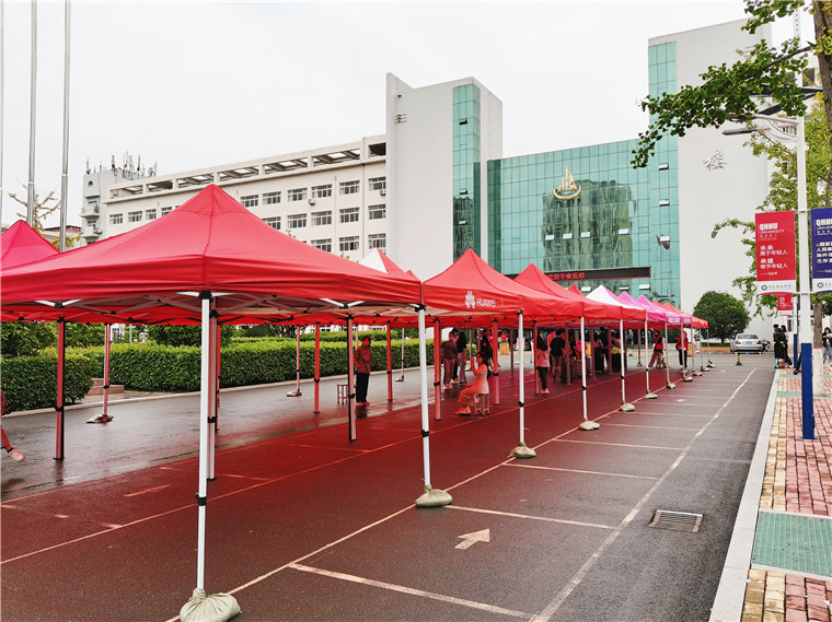 近日阴雨天气频繁,学校专门在返校通道搭建防雨棚,供返校学生休息等候。