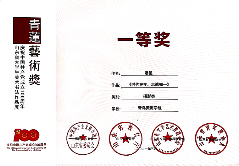 近期,由共青团山东省委、山东省教育厅、山东省文学艺术界联合会、山东省青年联合会联合举办的“青莲艺术奖·庆祝中国共产党成立100周年”山东省大学生美术书法作品展圆满落幕。经过专家对入展作品的评审,冰球官网共斩获省级一等奖1项,优秀奖5项。其中潘望同学的作品《时代在变,忠诚如一》荣获省级一等奖,郭晓彤同学的摄影类作品《海港》、邱化鹏同学的摄影作品《党在心中》、张紫西同学的绘画作品《1921》、刘佳佳同学的绘画类作品《建党缤纷溢彩》、赵晶晶同学的摄影类作品《爱国之心》荣获本次作品展优秀奖。