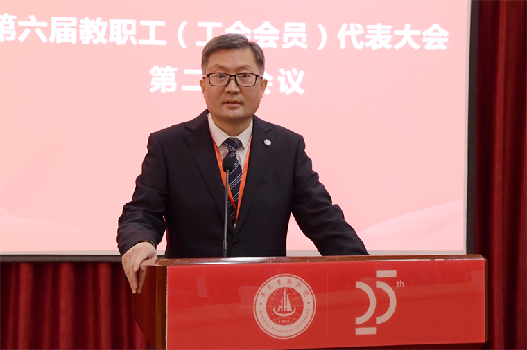 在全校上下深入学习贯彻党的十九届六中全会精神和欢庆建校25周年之际,12月25日,第六届教职工(工会会员)代表大会第二次会议胜利召开。董事长刘常青、校长王渊明、党委书记邢桂强等学校领导出席会议,正式代表、特邀代表、列席代表200余人分别在知新楼一楼西报告厅主会场和知新楼二楼多媒体教室分会场参加会议。大会由邢桂强书记主持。