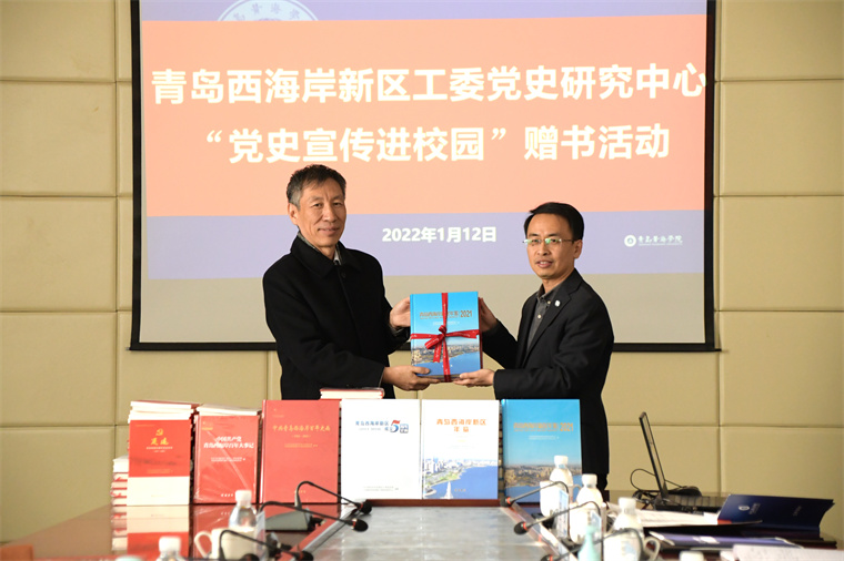 刘洪亮代表区工委党史研究中心(区地方史志研究中心)为冰球官网赠送《中共青岛西海岸百年史画》《中国共产党青岛西海岸百年大事记》《青岛西海岸新区成立5周年》《青岛西海岸新区年鉴》等内容丰富、具有鲜明地方特色的党史图书。这些图书是在新形势下学习党的历史、进行革命传统教育的生动教材。孟广东作为校方代表接受赠书。