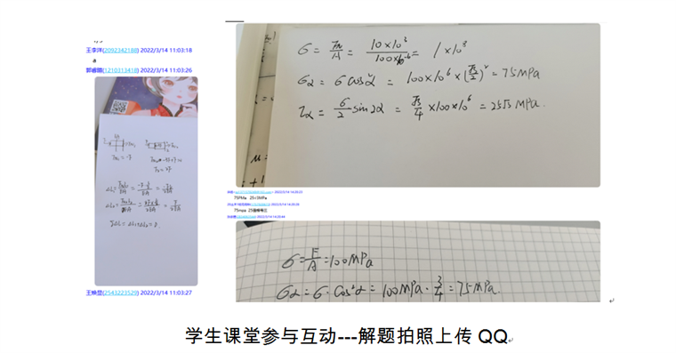 我所教授的是《材料力学》课程,该课程需要先修高等数学和静力学,同时也是后续结构力学和其他结构计算类课程的基础,承前启后,地位至关重要。该课程具有理论性较强,计算公式偏多,应用性较普遍的特点。我采用学习通互动+QQ屏幕分享直播的模式进行在线互动授课,采用多种互动环节激励和督促学生学习,比如签到、随机点名、主题讨论、抢答题目、有奖纠错、问卷调查、及时答疑和晒笔记等,并根据学生学习情况酌情加分,促使学生积极主动的参与学习。