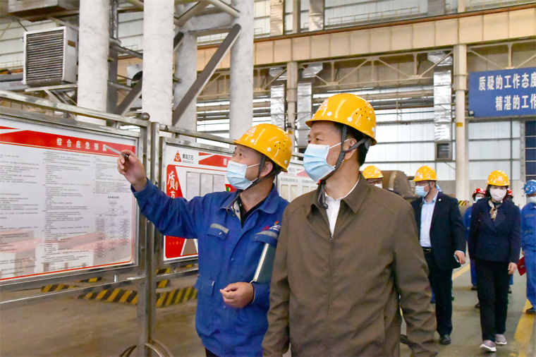 交流结束后,王渊明一行参观了青岛兰石的制造车间。青岛兰石是兰州兰石集团有限公司(简称兰石集团)为适应炼油化工装备向大型化发展的市场趋势,满足国家能源装备发展需求在青岛投资组建的全资子公司,是专业生产大型压力容器设备的制造企业。兰石集团是中国石化装备行业的先行者,创造了上百项“中国第一”和“中国之最”,被誉为“中国石化机械摇篮和脊梁”、“装备中国功勋企业”。