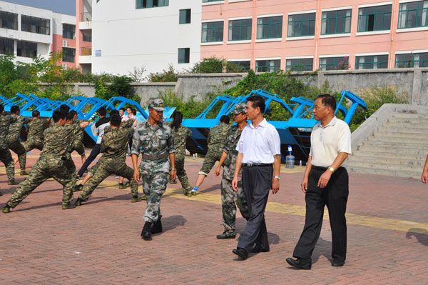 9月14日上午,校党委书记冯宜明、副院长杨春联等学校领导在军训团张万耀团长的陪同下,来到军训现场,视察军训工作,并对正在紧张训练的承训部队官兵和参训新生们表示亲切慰问。