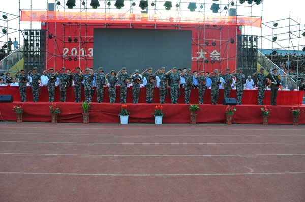 典礼在雄壮的国歌声中拉开帷幕。随后,阅兵仪式正式开始,在承训部队中队长张万耀的陪同下,焦奎院长检阅了参训方队,并向2013级参训新生致以亲切的问候,同学们则用响亮的呼声予以回应。经过为期两周的军训,参训新生们斗志昂扬、精神饱满、展现出奋发向上、奋勇争先的精神风貌。