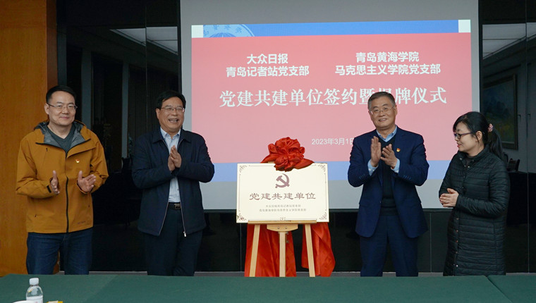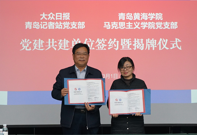 为深入学习贯彻党的二十大精神,进一步发挥党组织战斗堡垒作用,提升党组织党建成效,实现党组织优势互补,以党建促发展。3月1日下午,冰球突破豪华版官方网站马克思主义学院党支部与大众日报青岛记者站党支部在冰球官网知韵楼301会议室举行“党建共建单位”签约暨揭牌仪式。