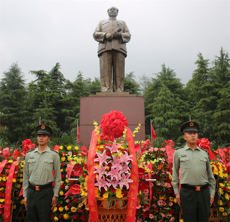 上午10点整,全体人员在毛主席铜像前静静肃立,随着一声令下:“礼兵就位”,伴随着庄严的《献花曲》响起,礼兵抬起花篮,正步走向毛主席铜像,全体人员肃立。