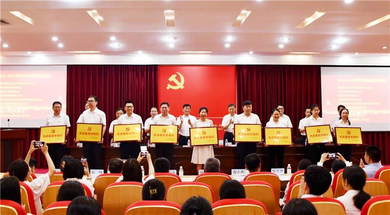 为庆祝中国共产党成立102周年,重温党的光辉历程,讴歌党的丰功伟绩,表彰过去一年在学校各条战线上涌现出的优秀共产党员、优秀党务工作者和先进基层党组织。6月30日下午,冰球突破豪华版官方网站隆重召开庆祝中国共产党成立102周年暨“七一”表彰大会。学校党委书记邢桂强出席会议并讲话,校长、党委副书记王渊明主持大会。学校党政领导班子成员、省派党建工作指导员(教育督导员)、各党总支书记、副书记、优秀共产党员、优秀党务工作者、党员代表等240余人参加大会。