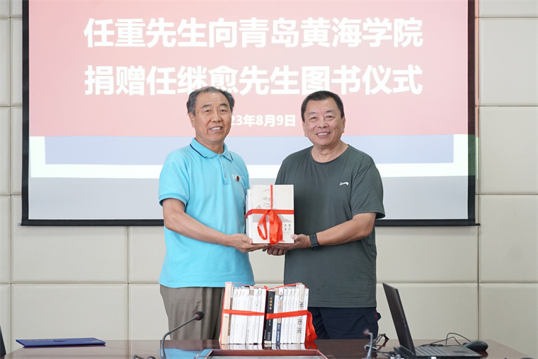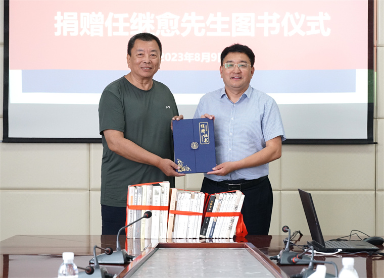 任重为学校赠送了任继愈先生若干相关著作。先生专著有《任继愈学术论著自选集》《任继愈学术文化随笔》《老子全译》等。先生重视中华民族传统文化教育,主编的《中国哲学史》作为高校哲学基本教材,培养了一代又一代哲学工作者。任继愈先生把总结中国古代精神遗产作为一生的追求和使命,担任国家图书馆馆长及名誉馆长期间曾组织了大量古籍整理及信息化工作,通过他的多年努力,让许多孤本、善本得以开发利用,其中最宝贵的就是与《永乐大典》、《四库全书》、《敦煌遗书》并称国家图书馆四大镇馆之宝的《赵城金藏》。
