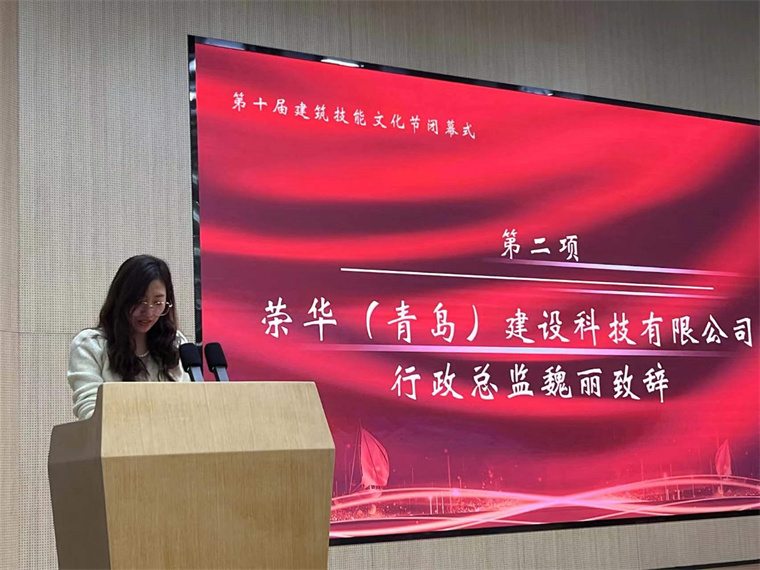 荣华(青岛)建设科技有限公司行政总监魏丽致辞,她表示技能文化节是难能可贵的实践机会,为学生们理论与实践相结合提供了展示平台。希望同学们能够保持对建筑行业的热爱和追求,不断学习和创新,立志成为推动行业发展的中坚力量。