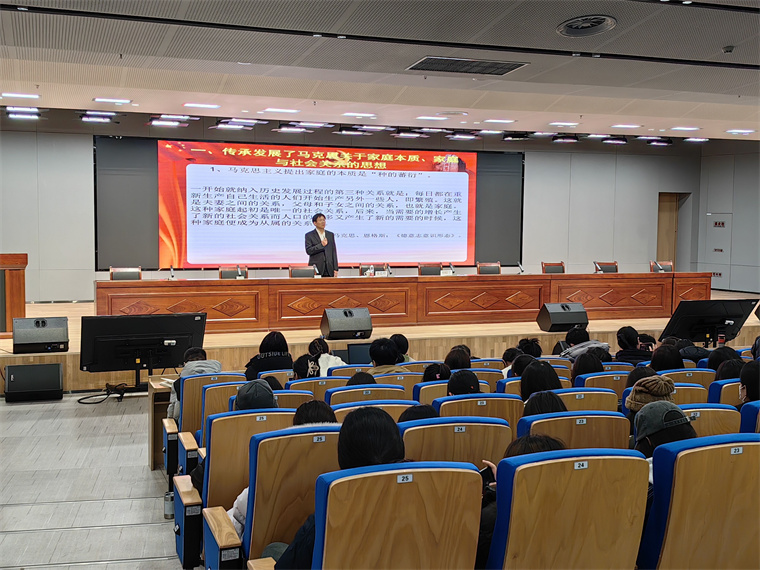 张教授通过讲述习近平总书记的故事,深入浅出、生动形象地为广大师生讲解了习近平新时代家庭观的内涵。家庭,是人类社会存在的基本单元,有了每个家庭,才创造了绵延不断的文化星辰。家庭,对于每个人的品德和价值观的养成有着重要作用。2018年,习近平主席全国妇联新一届领导班子的谈话中,首次提出要引导家庭成员牢固树立新时代家庭观,强调重视家庭、家教、家风建设。习近平新时代家庭观主要传承了马克思、恩格斯关于家庭本质、家庭与社会、与时代的思想;传承了马克思主义关于妇女解放,实现男女平等的思想;传承了马克思主义关于孩子能力发展取决于父母能力发展的思想;传承了马克思主义关怀儿童的思想。