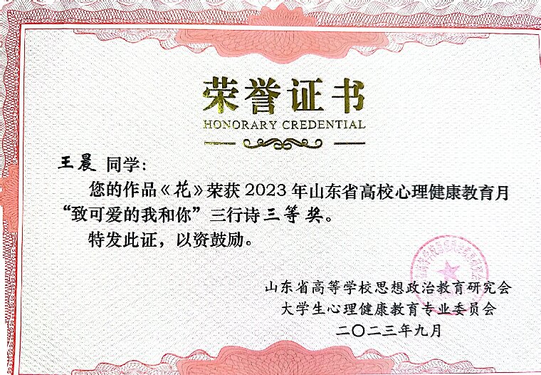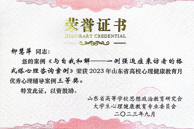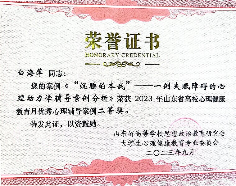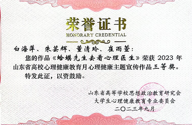 在山东省高等学校思想政治教育研究会大学生心理健康教育专业委员会举办的2023年山东省高校心理健康教育月展示活动中,经高校推荐、专家评审、网上公式等环节,冰球官网4项作品获奖。白海萍老师的心理案例《“沉睡的本我”——一例失眠障碍的心理动力学辅导案例分析》荣获二等奖,柳慧萍老师的心理案例《与自我和解——一例强迫症来访者的格式塔心理咨询案例》荣获三等奖。白海萍老师、董清玲、崔雨萱心理主题宣传作品《蛤蟆先生去看心理医生》荣获三等奖。医学院学生王晨的三行诗《花》荣获三等奖。