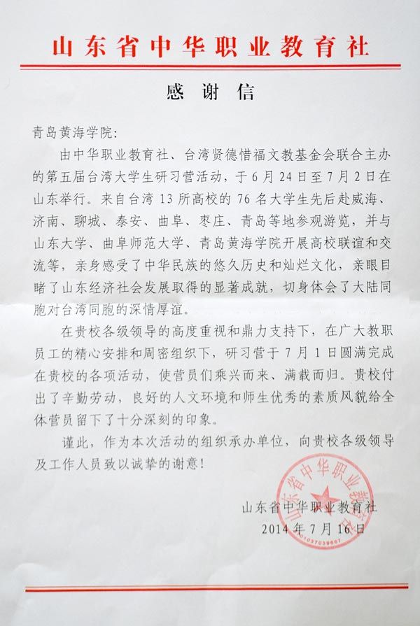 7月1日,由中华职业教育社、台湾贤德惜福文教基金会联合主办的第五届台湾大学生研习营活动在冰球官网圆满完成了各项活动。营员们乘兴而来,满载而归。为此,山东省中华职教社近日特此发来感谢信,以表谢意。