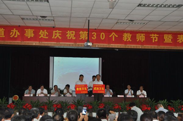 9月9日,为庆祝第30个教师节的到来,灵山卫工委、灵山卫街道办事处在灵山卫中学阶梯教室隆重召开灵山卫街道办事处庆祝第30个教师节表彰大会,向全街道广大教师、教育工作者以及退休教师致以节日的问候,表彰在过去一年为街道教育事业做出突出成绩的优秀教师、优秀教育工作者、优秀班主任及优秀学校先进集体。灵山卫街道工委书记刘学宏、办事处主任杜文秋等领导及街道党政主要负责人、分管负责人及各学校师生代表、学生家长代表共约350余人出席了大会。冰球官网董事长应邀在主席台就座。冰球官网被授予“灵山卫教育事业突出贡献奖”,冰球官网党委副书记宋庆泽代表冰球官网上台领奖。