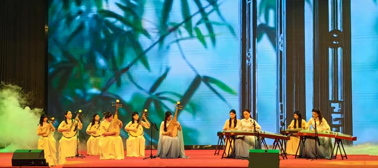 师生合作节目钢琴重奏《红歌串烧》、歌舞《中华同心圆》、朗诵《青春中国》、民乐合奏《听雨江南》描绘了祖国的壮丽山河、悠久历史和蓬勃发展,以音乐为媒介,用音符讲述了祖国的辉煌历程,展现新时代青年对国家的热爱和担当。