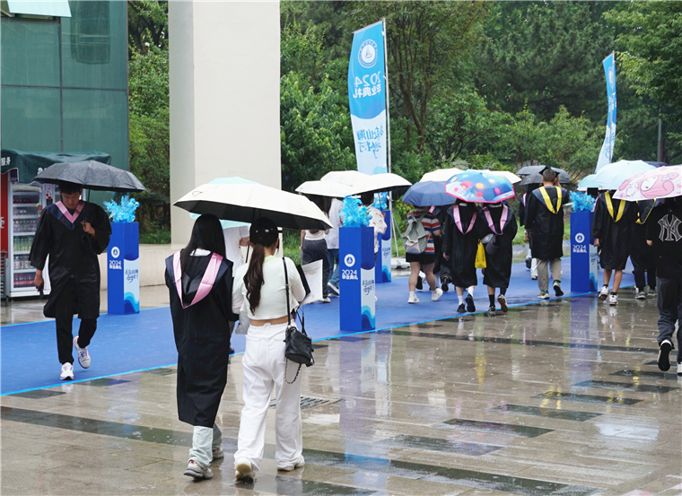 毕业典礼结束后,学校领导、老师们全体起立,与毕业生挥手告别,目送毕业生们依次离场。细雨蒙蒙,临别依依,万语千言,尽在不言中。