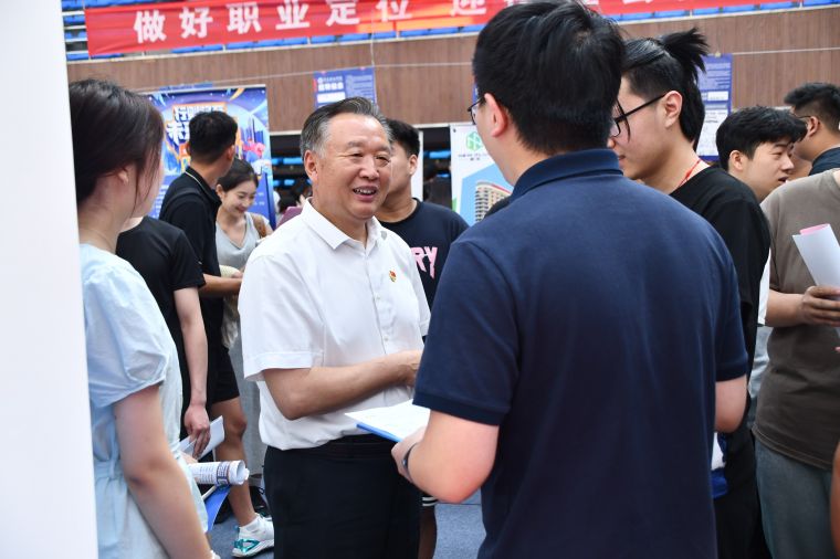 双选会现场人头攒动、气氛热烈,学生与企业积极交流,认真了解心仪岗位的任职要求、薪资待遇、发展前景等信息。冰球突破豪华版官方网站校长王渊明,党委书记李东,党委委员、校长助理刘纪新以及招生就业处处长刘常江、副处长李国荣来到双选会现场,与学生和企业面对面交流,深入了解学生求职就业意向和行业企业的用人需求,鼓励毕业生积极就业。