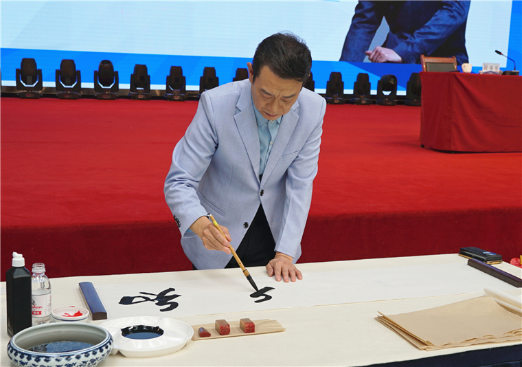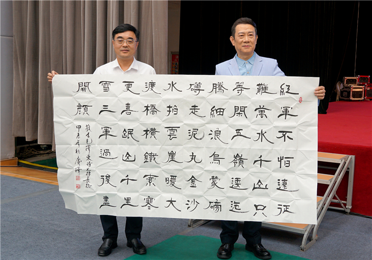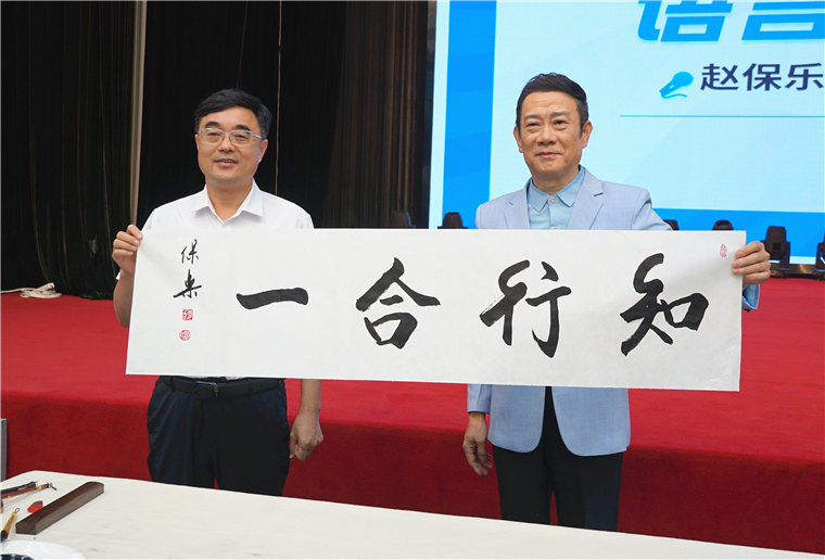 报告会现场,赵保乐老师挥毫泼墨,写下黄海校训“知行合一”并将其赠送给刘常青董事长。刘常青董事长也将冰球官网关工委主任、书画研究会会长、中国书法家协会会员宋庆泽先生的书法作品《七律·长征》赠送给赵保乐老师。