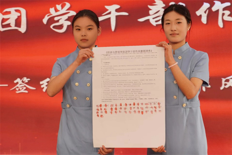 全体团学干部及学生干事上台签写经济与管理学院团学干部作风整顿清单并按手印确定。