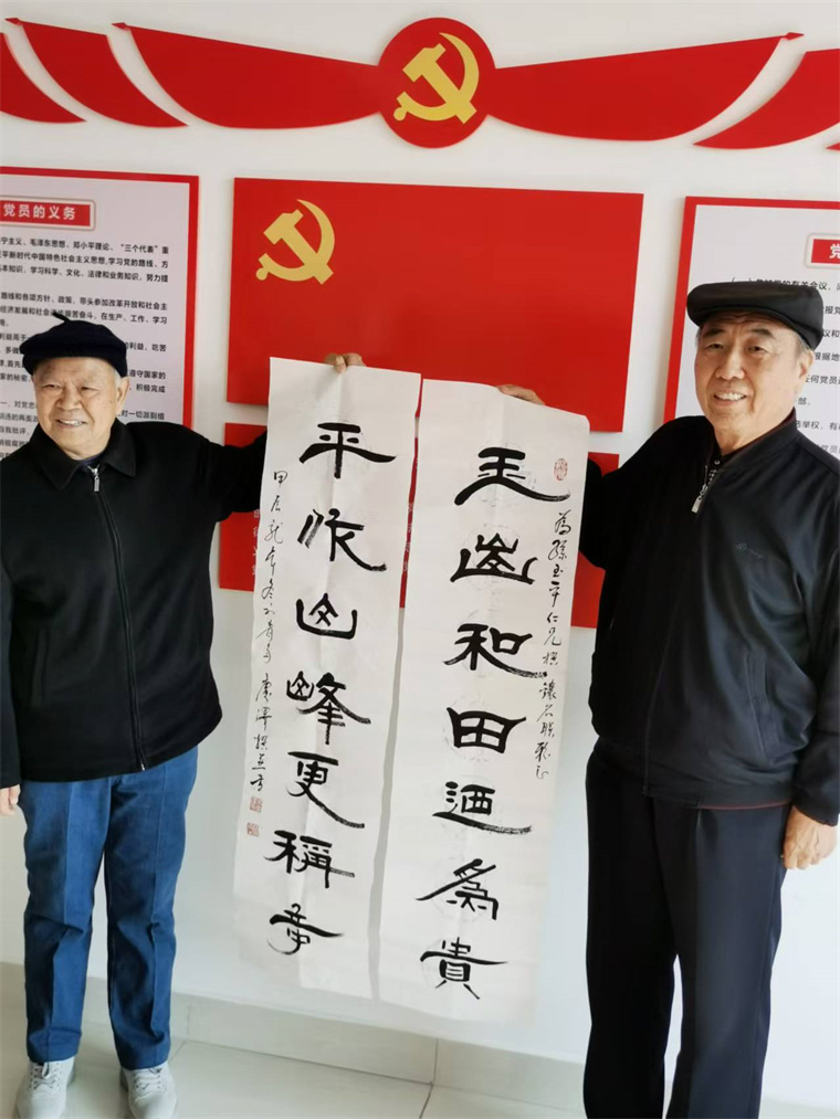 作为中书协会员的宋庆泽向孙玉平、彭宝恩分别赠送了由他撰题的镶名联。孙玉平则向宋庆泽赠送了由他撰题的楹联和他摄制的荣获国家级政府一等奖的系列片《中华泰山》光盘和著作。